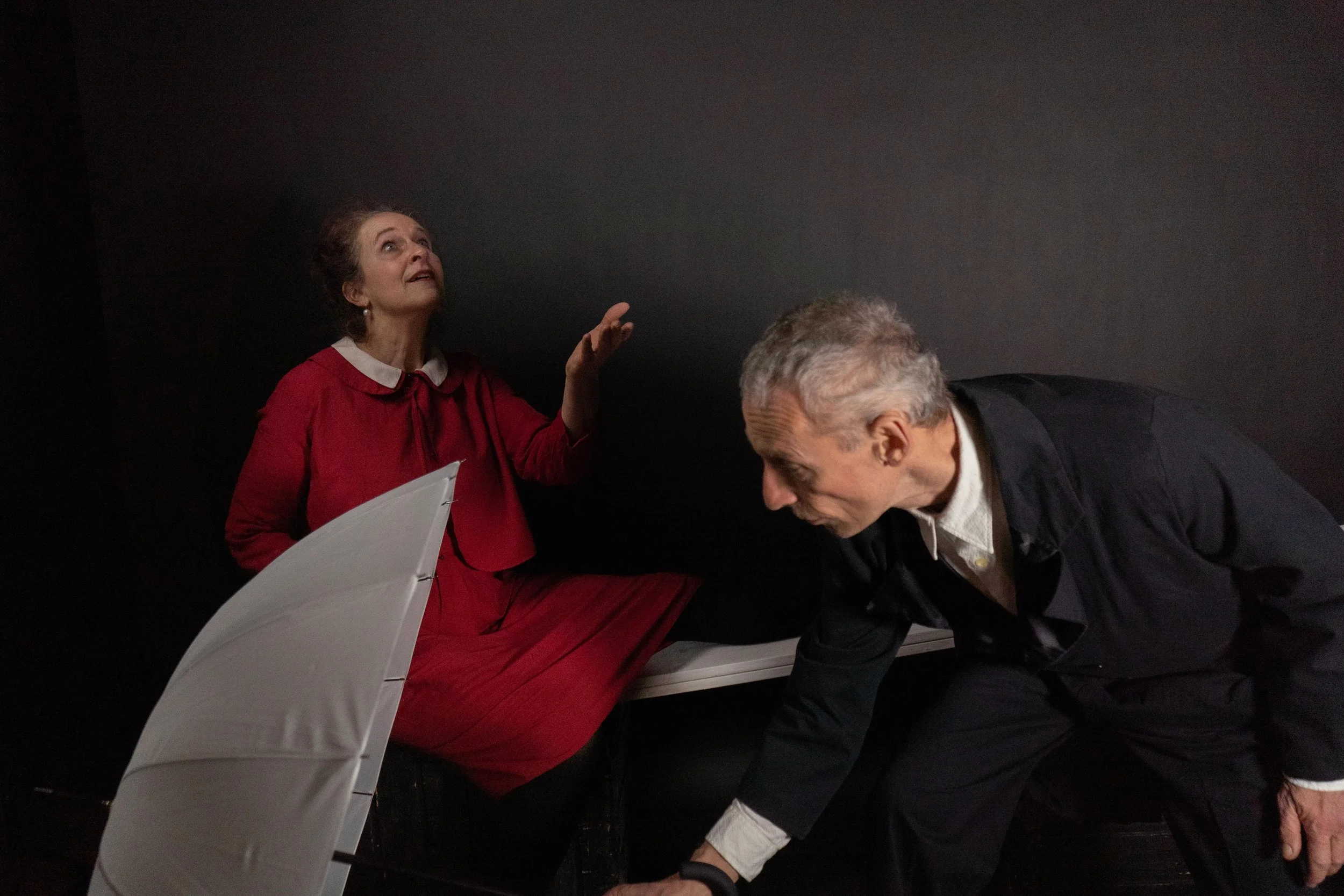 Ungewöhnlich und skurril-theatralisches Kammerspiel um die Liebe. Eine Liebesgeschichte? - schon wieder! Aber diese ist eine ungewöhnliche Liebesgeschichte, eine ganz andere. Das man über die Liebe schauspielern kann, ohne in die Klischeekiste zu greifen, beweisen „Die Gnädige Frau und der Herr“. Wie einfach wäre es doch für die Gnädige Frau mit dem großen Koffer und den befrackten Herrn mit dem großen weißen Schirm, könnten sie sich von ihren „Kleinigkeiten“ befreien. Gefangen in Gewohnheiten und unüberdachten Konsequenzen kommt der Mensch nicht vom Fleck und wird angepasst, unflexibel. Je absurder die formulierten Gedanken der beiden klingen, desto belustigender für’s Publikum, das lacht, ohne zu merken, dass es auch über sich selbst lacht, denn was wäre der Mensch so ganz ohne seine Gewohnheiten, die, wenn ausgesprochen, zumindest für andere oft genug zum Totlachen sind. Lassen sich nicht allzuoft Karriere, Konsum, Haus, Auto und andere Äußerlichkeiten synonym für Schirm („es regnet im Stück nicht!) und Koffer („ich hätte ihn füllen können, aber dann wäre er noch schwerer geworden“) verwenden? Auf liebenswerte Weise präsentierten die beiden Schauspieler die Schwächen der Menschen – ohne erhobenen Zeigefinger, selbst „einer von uns“. Böblinger Zeitung